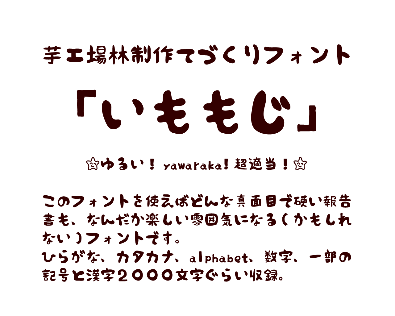 「いももじ」はすべて無料・商用利用可能です。フォントファイルそのもの、または改変・トレースしたフォントデータを無断で再配布・販売することはおやめください。「いももじ」の使用によるトラブル、不利益には一切の責任を負いません。